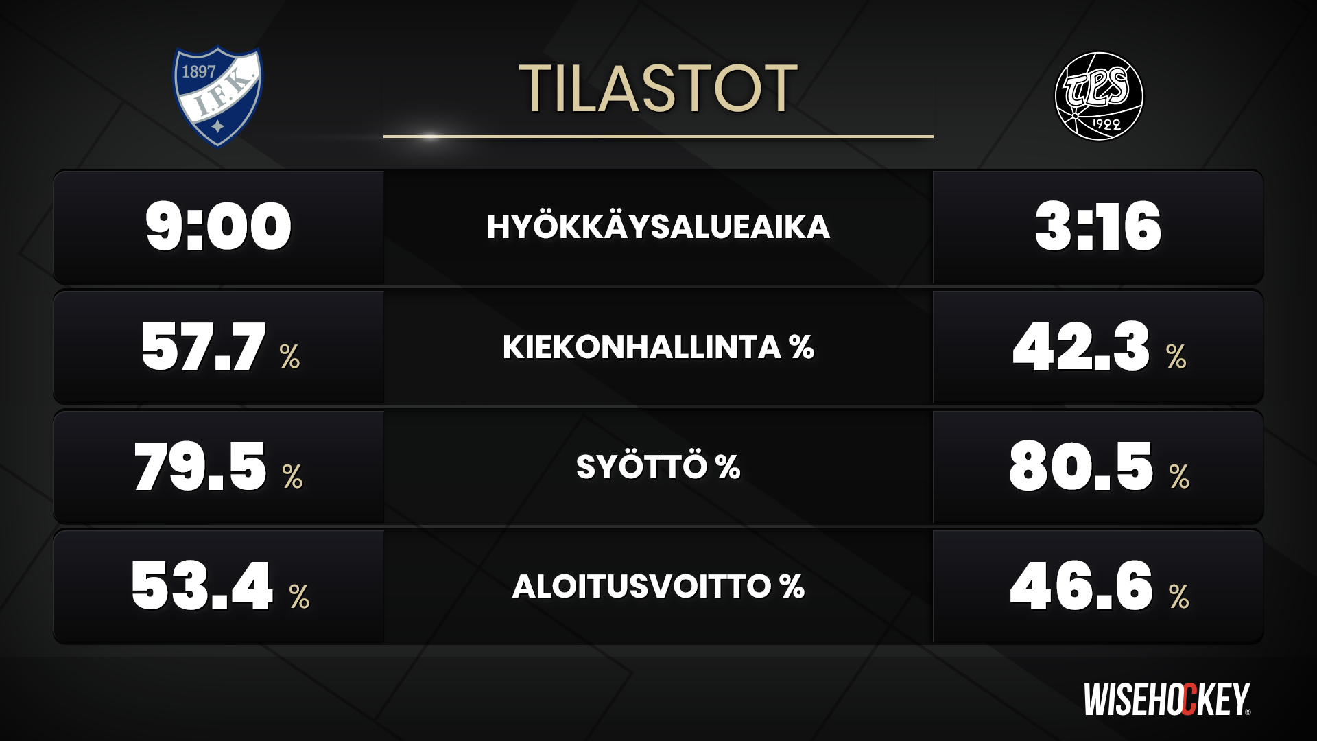 TPS ei ottelun aikana saaneet juurikaan organisoituja hyökkäyksiä aikaiseksi, mutta sitkeästi vieraat pysyivät mukana. Turkulaisten tasoitusosuma syntyi kun peliaikaa oli jäljellä viitisen minuuttia. Hetkeä myöhemmin katsomossa alkoi sykkeet nousta kun Gimmat joutuivat kahden minuutin alivoimalle.